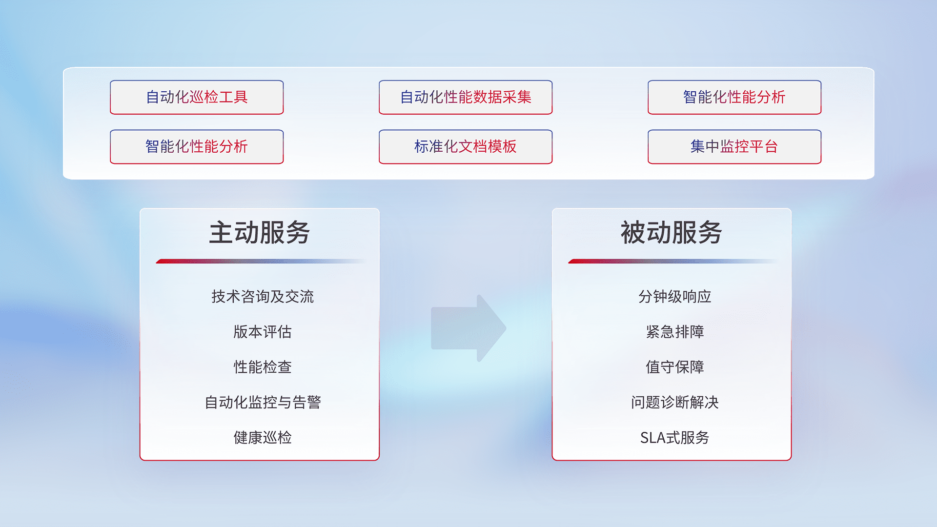 智能化工具和标准化文档,,,,保障服务质量,,提供主动服务(包含技术咨询、、、版本评估、、、、性能检查、、、、自动化监控与告警、、、、健康巡检)和被动服务包含(分钟级响应、、紧急排障、、值守保障、、、问题诊断解决、、SLA服务)。。